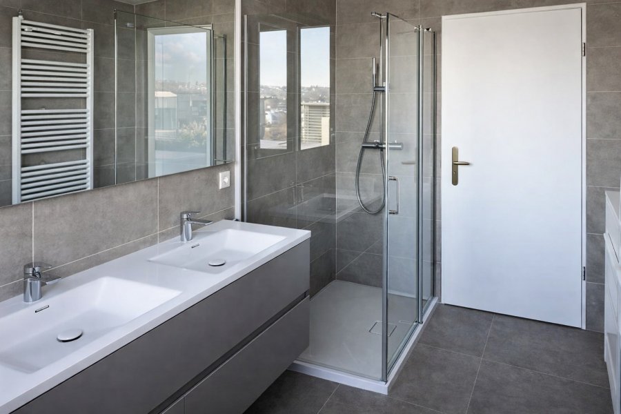 1 salle de douche neuve avec double lavabo